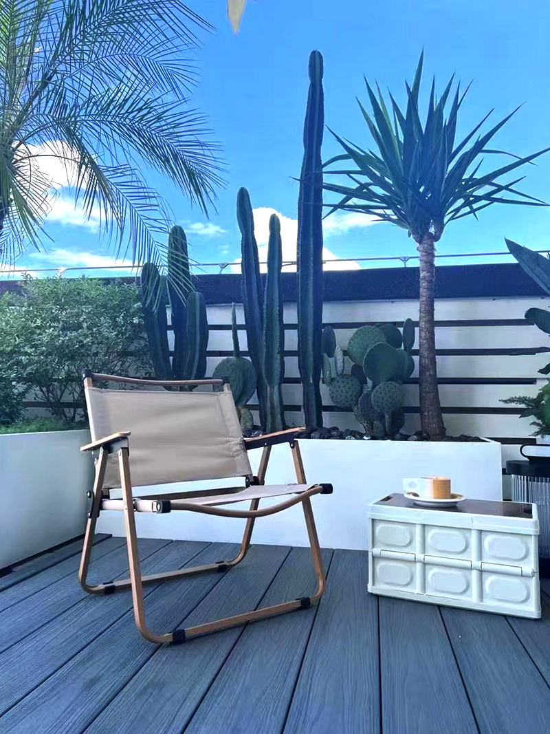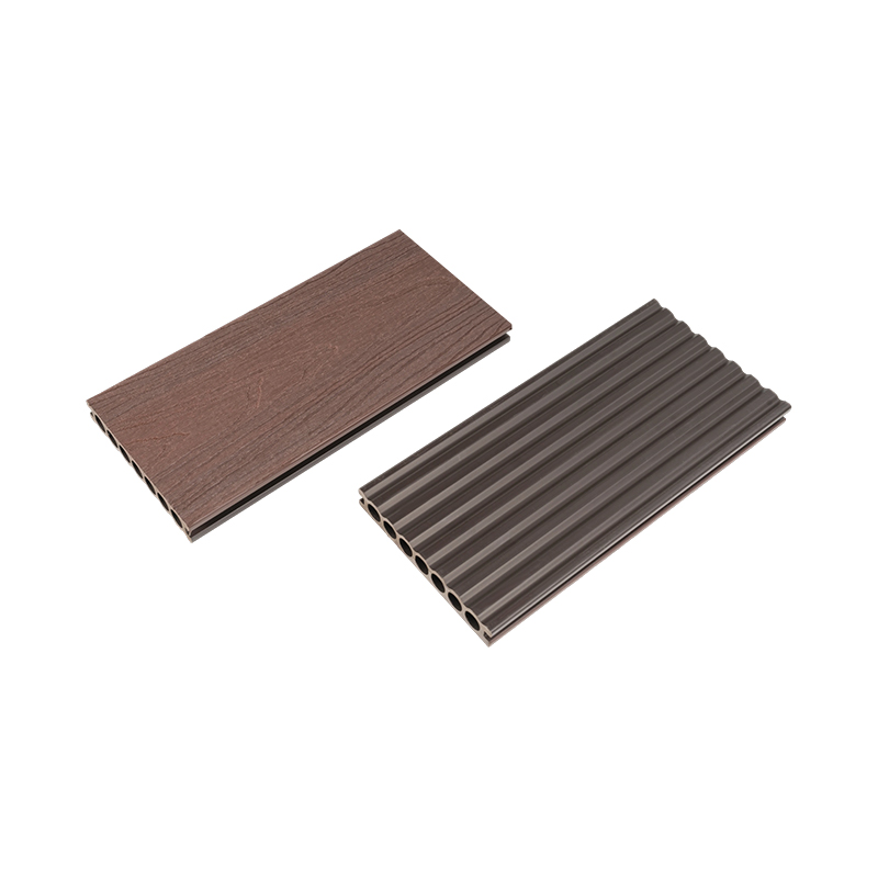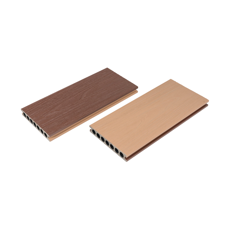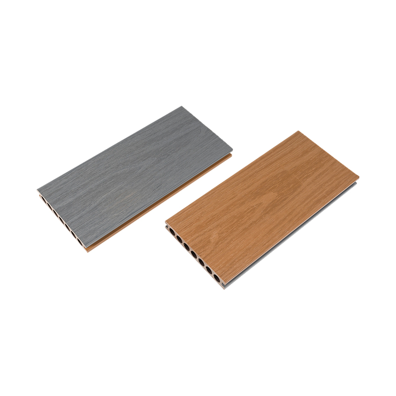 Hohl-HKV-Zweifarbige Koextrudierte Verbund-Terrassendielen sind Hohl-Terrassendielen aus Holz-Kunststoff-Verbund (HKV), hergestellt im Koextrusionsverfahren. Der Kern besteht aus einer Mischung aus hochdichten recycelten Hartholzfasern, Weichholzfasern und 100 % recycelten Plastikflaschen (HDPE). Die Oberfläche ist mit einer PE-Folie mit 3D-Holzmaserung beschichtet, wodurch eine natürliche Holzmaserungstextur und ein zweifarbiger visueller Effekt entstehen. Die üblichen Produktspezifikationen sind 140 mm x 23 mm (auf Anfrage anpassbar). Das Profil ist rund und hohl und wird in einem einzigen Schritt mithilfe einer Hochtemperaturform geformt, wodurch die Verwendung schädlicher Klebstoffe entfällt.