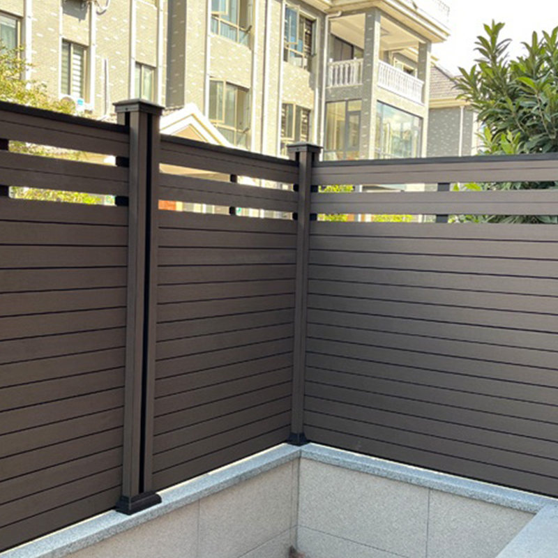 WPC Holz-Kunststoff-Verbundzäune verbinden die Schönheit natürlicher Holzmaserung mit der Haltbarkeit von Kunststoff. Sein modularer Aufbau ermöglicht eine schnelle Montage von Pfosten und horizontalen Paneelen mithilfe von Schlitzen oder Schrauben und eignet sich daher sowohl für die Heimwerker- als auch für die professionelle Installation. Der auf dem Foto gezeigte Zaun ist dunkelgrau (Holzkohlegrau) mit klaren Linien und einer zaunähnlichen Struktur. Die gleichmäßig verteilten horizontalen Paneele sorgen für Belüftung und Lichtdurchlässigkeit und bieten gleichzeitig eine gute Sichtschutzbarriere. Das Gesamtdesign ist modern und stabil und lässt sich problemlos in eine Vielzahl von Außenumgebungen integrieren, darunter Innenhöfe, Gärten und Gewerbeterrassen.